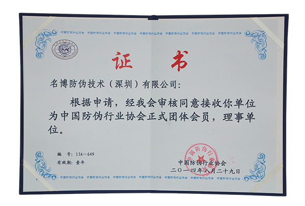 名博公司于1993年成立,是亞太防偽協(xié)會會員、中國防偽協(xié)會理事單位。公司集研發(fā)、生產(chǎn)、銷售為一體,專業(yè)提供各種防偽油墨、防偽材料、防偽制品,是中國知名防偽產(chǎn)品制造商之一。